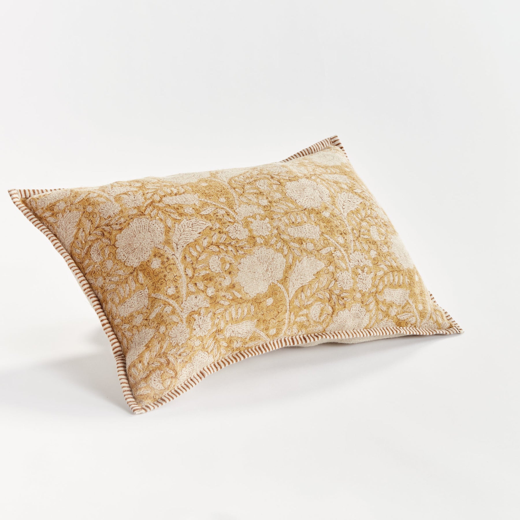 The Pascaline European Linen Lumbar Pillow in a warm ochre shade and cream floral pattern is complete with coordinating striped ribbing along all sides. Luxury meets comfort with our exclusive block print pillows. Made with European flax fiber, yarn-dyed and pre-shrunk for optimum quality, and complete with an alternate down insert. This indoor pillow is the ultimate in refinement. Pick your favorite patterns for a mix & match casual approach.